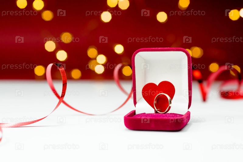 Золотое кольцо, обручальное кольцо в красной коробке и красное сердце на бело-красном фоне с красивым боке. Момент свадьбы, юбилея, помолвки или Дня святого Валентина. Счастливый день