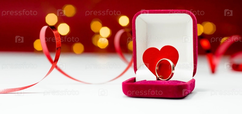 Золотое кольцо, обручальное кольцо в красной коробке и красное сердце на бело-красном фоне с красивым боке. Момент свадьбы, юбилея, помолвки или Дня святого Валентина. Счастливый день