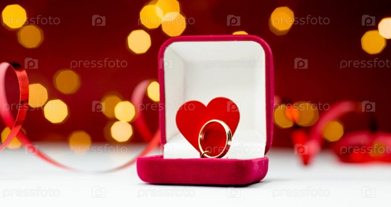 Золотое кольцо, обручальное кольцо в красной коробке и красное сердце на бело-красном фоне с красивым боке. Момент свадьбы, юбилея, помолвки или Дня святого Валентина. Счастливый день