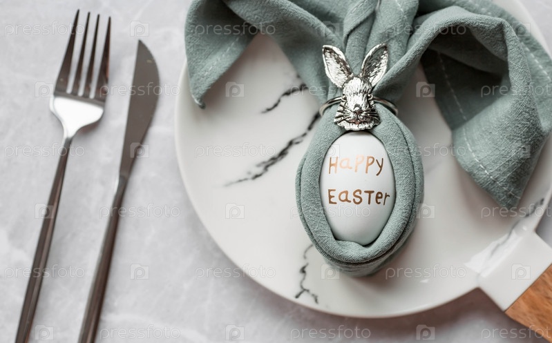 Баннер. Сервировка стола. Модная мраморная тарелка с кроликом и яйцом в салфетке на сером фоне. Вид сверху. Концепция счастливого пасхального праздника для кафе и ресторанов