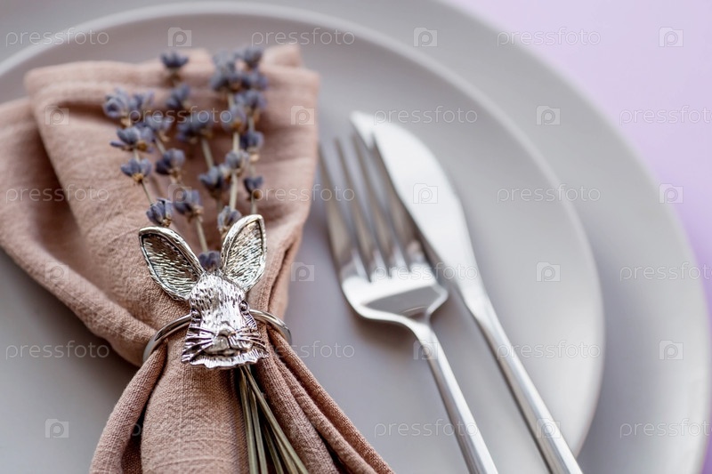 Концепция счастливого, светлого праздника Пасхи. Сервировка стола. Тарелка с кроликом на салфетке, лавандой и пасхальными яйцами на модном фоне 2022 года — это очень красиво. Вид сверху