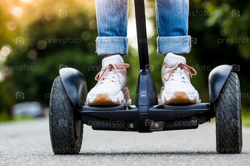 Молодая девушка-хипстер за рулем ховерборда на открытом воздухе в парке, активная женщина, балансирующая на современной электрической доске, концепция будущего, альтернативный транспорт, экология и окружающая среда