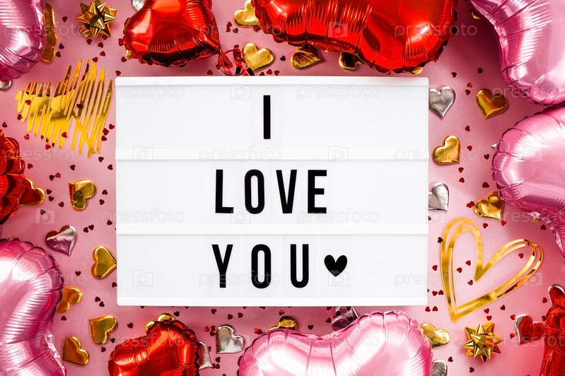 Стильный лайтбокс с текстовой рамкой и надписью я тебя люблю. Розовые, красные и золотые сердца повсюду. Вид сверху на воздушные шары из фольги на День святого Валентина. Копипространство