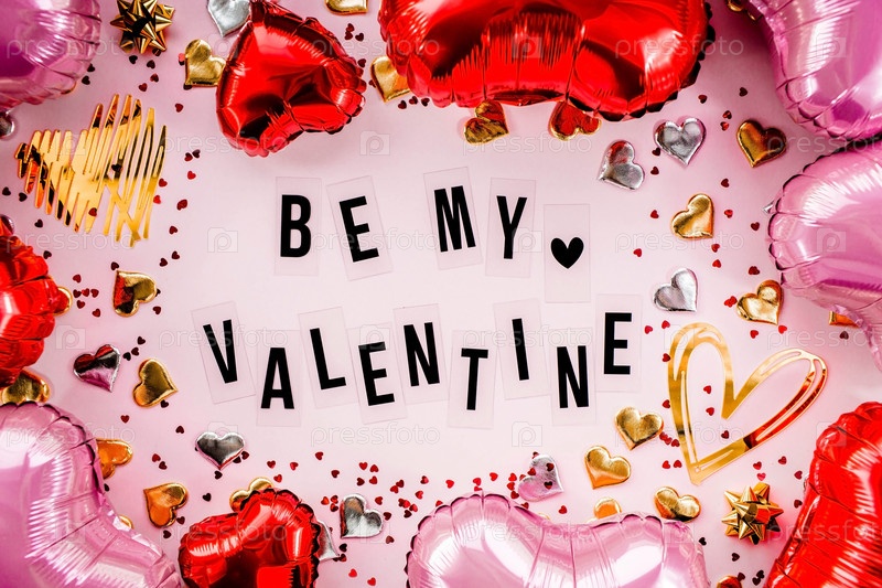 Стильная текстовая рамка с надписью «Будь моей валентинкой». Розовые, красные и золотые сердца повсюду. Вид сверху на воздушные шары из фольги на День святого Валентина. Копипространство