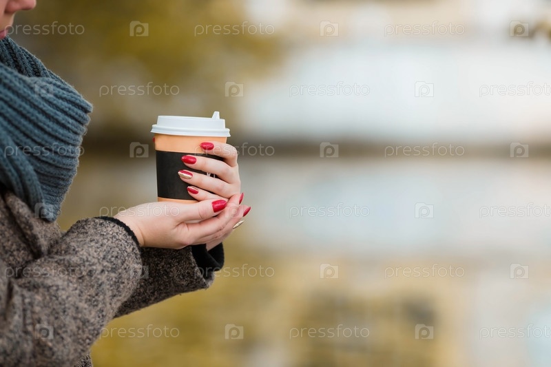 Кафе и рестораны. Чашка кофе в руках девушки. Место для этикетки. Горячие напитки с тобой в дороге