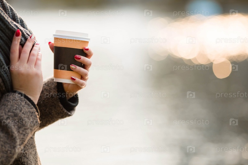 Кафе и рестораны. Чашка кофе в руках девушки. Место для этикетки. Горячие напитки с тобой в дороге