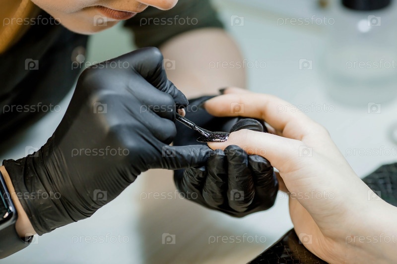 Мастер маникюра в салоне красоты выполняет процедуру окрашивания ногтей клиента. Женская мода и красота. Самообслуживание