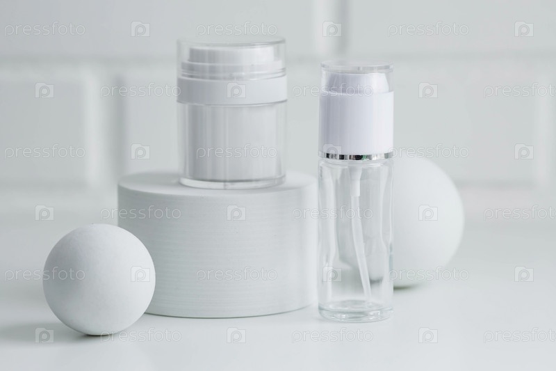 Стеклянные белые бутылки на подиуме для масла, лосьона, крема и зеленой ветки на фоне кирпичной стены. Натуральная косметика. Макет брендинга салона красоты