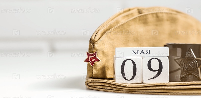 Праздник 9 мая. Георгиевская лента, военная фуражка, деревянный календарь на белом фоне. Понятие Великой Победы или Дня защитника Отечества. Копия текстового пространства
