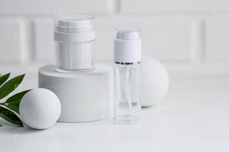 Стеклянные белые бутылки на подиуме для масла, лосьона, крема и зеленой ветки на фоне кирпичной стены. Натуральная косметика. Макет брендинга салона красоты