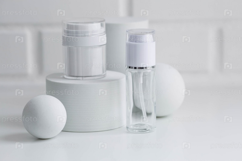 Стеклянные белые бутылки на подиуме для масла, лосьона, крема и зеленой ветки на фоне кирпичной стены. Натуральная косметика. Макет брендинга салона красоты