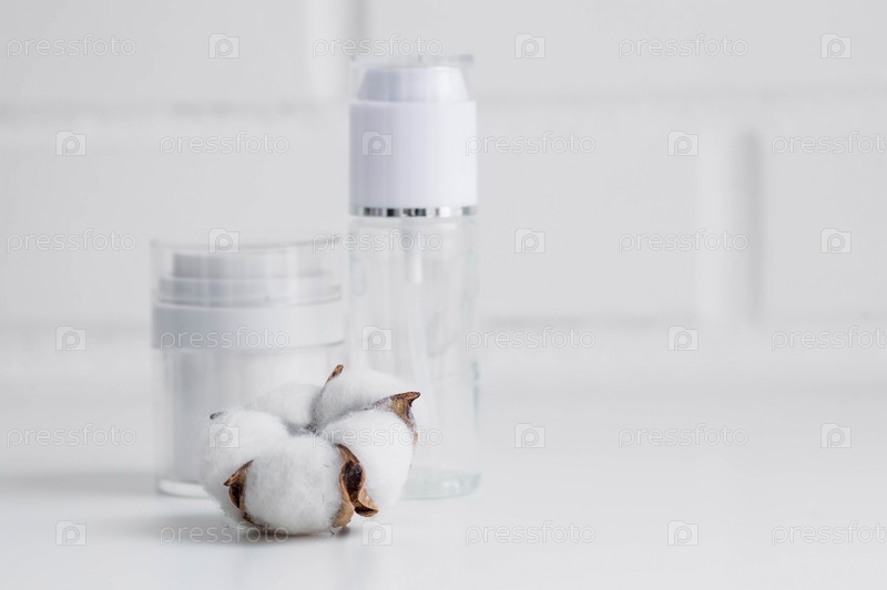 Стеклянные белые бутылки на подиуме для масла, лосьона, крема и зеленой ветки на фоне кирпичной стены. Натуральная косметика. Макет брендинга салона красоты