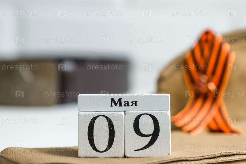 Праздник 9 мая. Георгиевская лента, военная фуражка, деревянный календарь на белом фоне. Понятие Великой Победы или Дня защитника Отечества. Копия текстового пространства