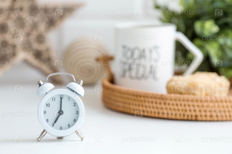 Белый ретро-будильник, торт и чашка кофе на фоне белой кирпичной стены. Понятие «доброе утро»