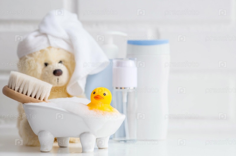 Детские банные принадлежности. Забота о ребенке. Мишка с полотенцем на голове, щеткой и бутылочками с шампунем. Миниатюрная пена для ванны и желтый резиновый утенок для купания