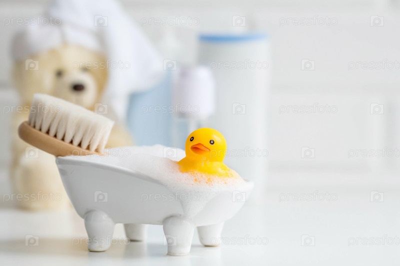 Детские банные принадлежности. Забота о ребенке. Мишка с полотенцем на голове, щеткой и бутылочками с шампунем. Миниатюрная пена для ванны и желтый резиновый утенок для купания