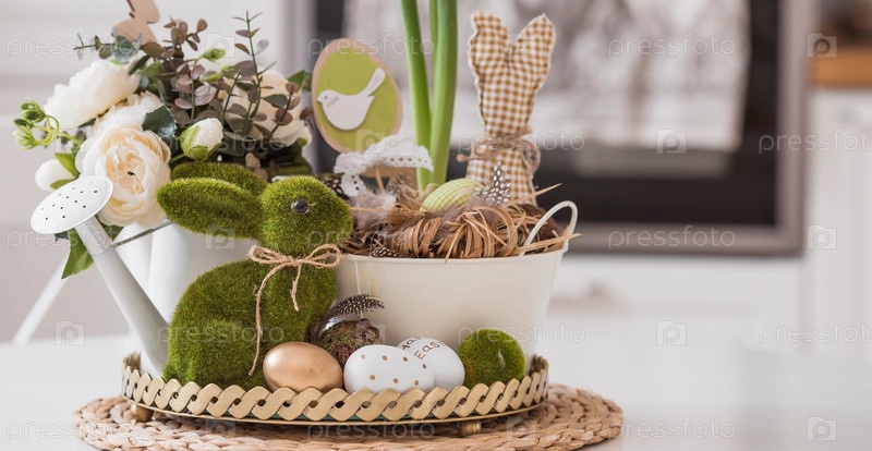 Железный горшок с пасхальными яйцами, цветами и кроликами на столе. На заднем плане белая кухня в скандинавском стиле. Концепция домашнего уюта и декора в светлый праздник Пасхи 2023