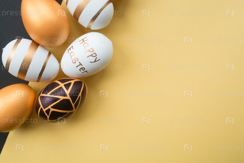 Золотые, черные, белые пасхальные яйца на желто-черном фоне. Геометрия. Минимальная концепция. Вид сверху. Карточка с местом для копирования текста