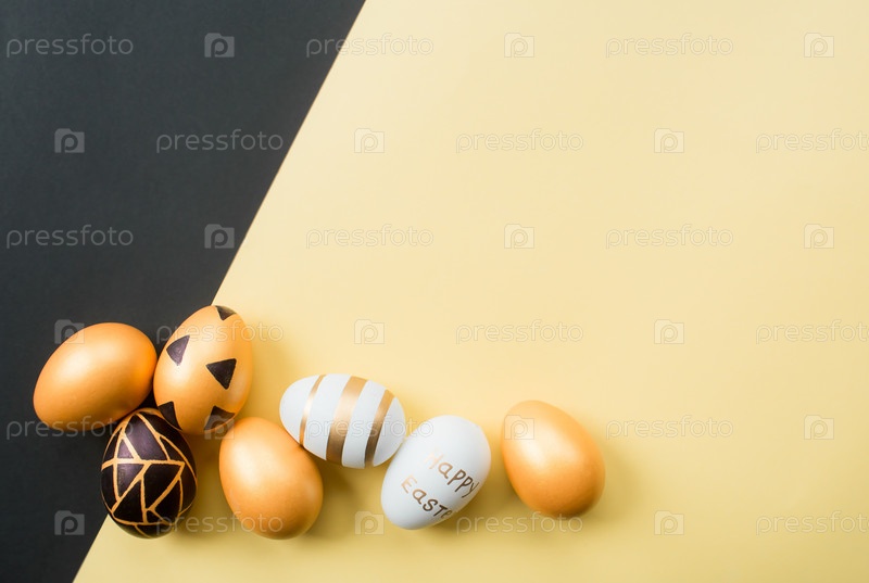 Золотые, черные, белые пасхальные яйца на желто-черном фоне. Геометрия. Минимальная концепция. Вид сверху. Карточка с местом для копирования текста