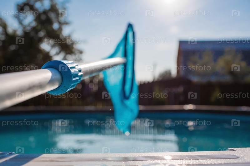 Абстрактное размытие и расфокусированный фон. Очистка бассейна с металлическим каркасом с сеткой от грязи. Очиститель бассейнов во время работы. Солнечное знамя. Концепция летнего отдыха