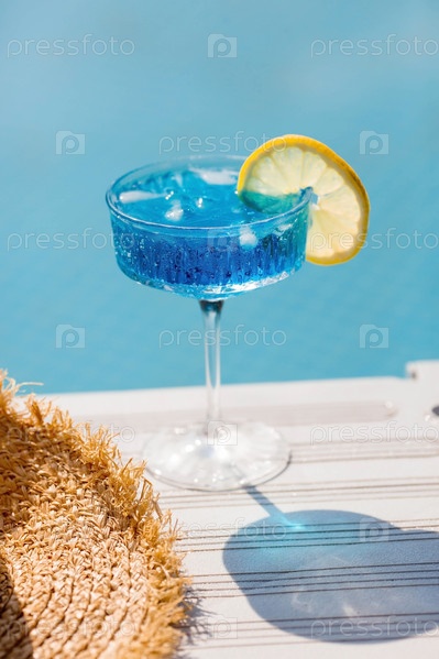Стакан вкусного голубого коктейля Голубая лагуна и желтые лимоны на фоне бассейна. Алкогольный коктейль из сочных фруктов блю с ликером кюрасао, кубиками льда и долькой лимона