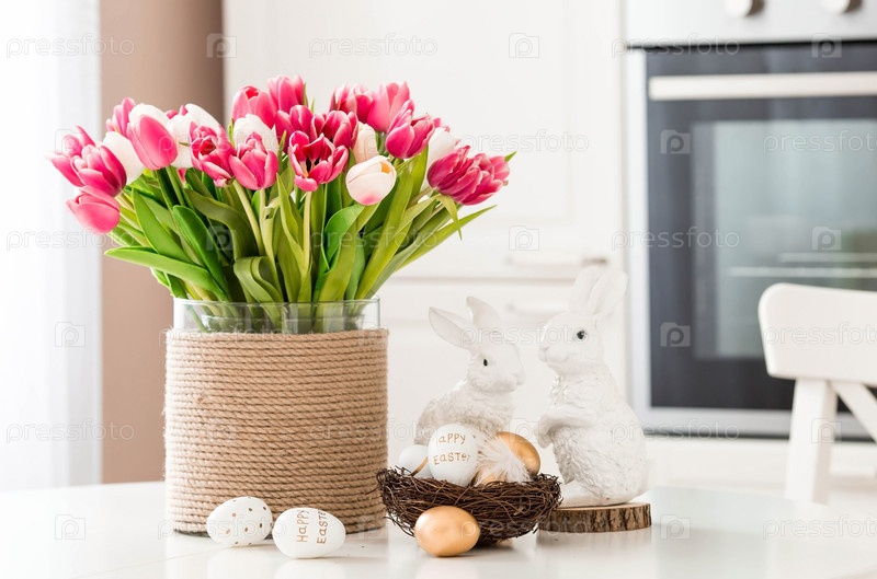 Букет тюльпанов, пасхальные кролики и яйца с золотым узором на столе. На заднем плане белая кухня в скандинавском стиле. Красивая открытка. Минимальная концепция