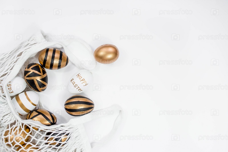 Золотые, черные, белые пасхальные яйца в авоське на белом фоне. Геометрия. Минимальная концепция. Вид сверху. Карточка с копией места для текста