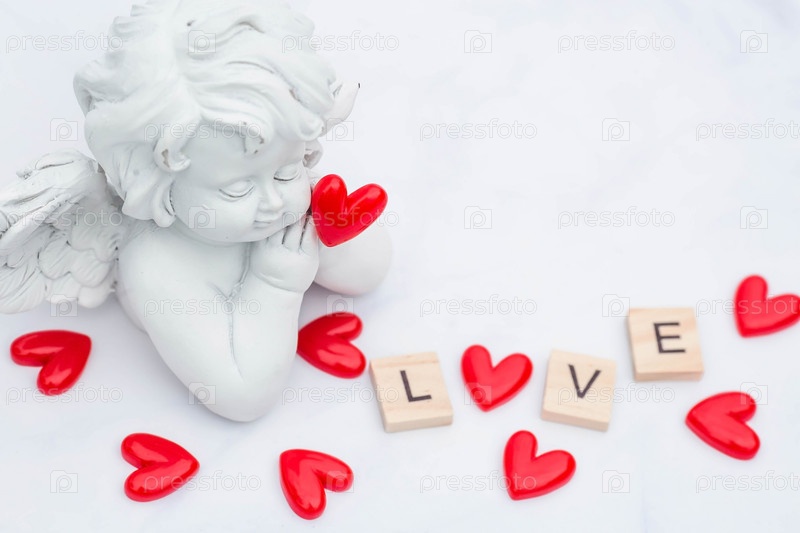 Слово «Любовь» и милый ангел на белом мраморном фоне. Любовь на деревянных кубиках. Тема любви. День Святого Валентина. Деревянные блоки со словом любовь. Положительные эмоции