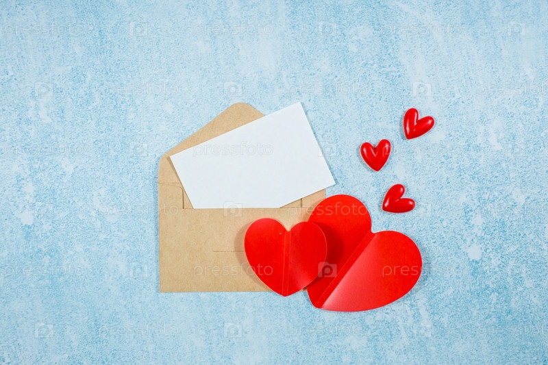 Красные сердца, конверт и белый лист бумаги для текста на синем фоне с копией пространства. Концепция праздничного поздравления ко дню святого Валентина