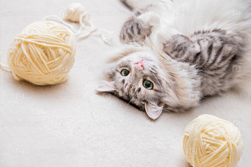 Пушистый милый серый кот весело играет с клубками пряжи, запутанными нитями, лежит среди мотков