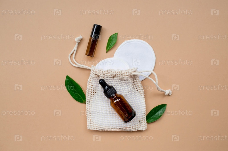 Контейнер с лосьоном, многоразовые ватные диски в хлопчатобумажной сумке на бежевом фоне, вид сверху. Натуральная органическая эко косметика. Макет брендинга салона красоты
