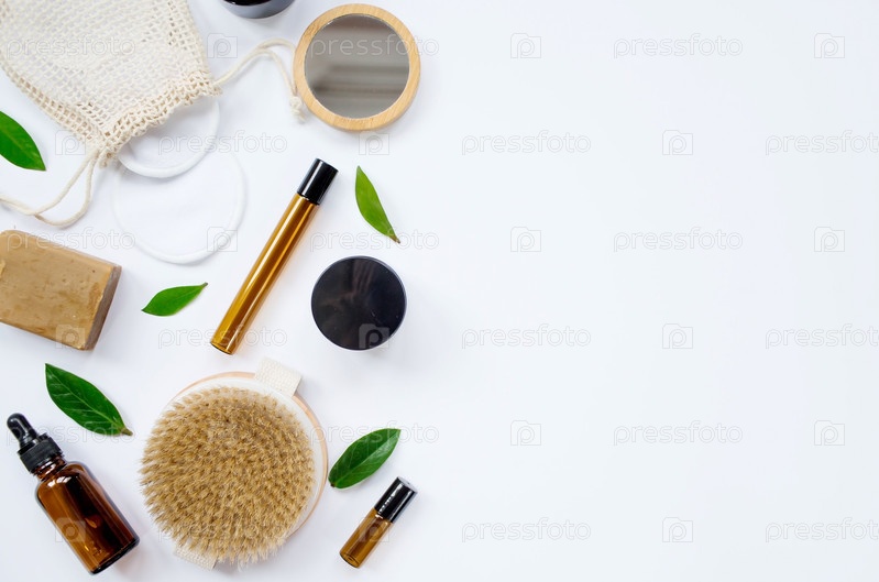 Контейнеры с лосьоном, кремом, массажной щеткой на белом фоне, вид сверху. Натуральная органическая эко косметика. Макет брендинга салона красоты