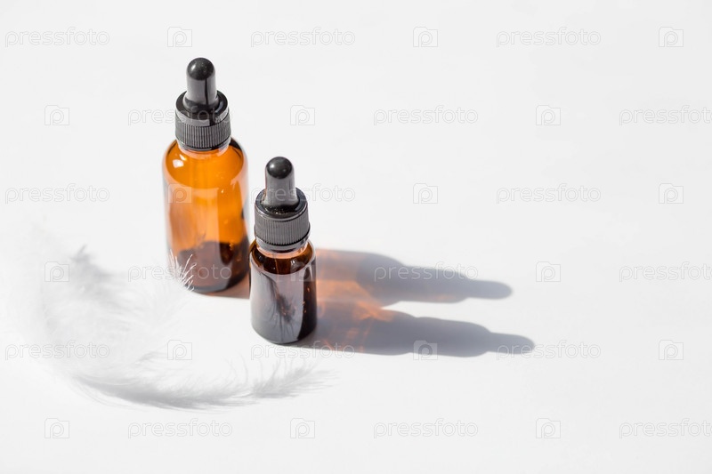 Макет брендинга салона красоты. Стеклянная бутылка-капельница и ручка в солнечный день на белом фоне. Натуральная органическая экокосметика