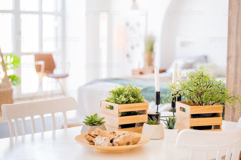 Комнатные растения в декоративных коробках на фоне современного чистого интерьера, место для вашего текста