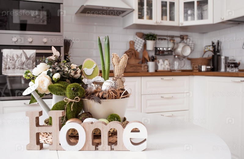 Железный горшок с пасхальными яйцами, цветами и кроликами на столе. На заднем плане белая кухня в скандинавском стиле. Концепция домашнего уюта и декора в светлый праздник Пасхи 2023