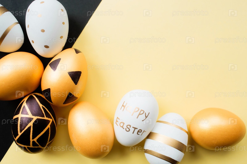 Золотые, черные, белые пасхальные яйца на желто-черном фоне. Геометрия. Минимальная концепция. Вид сверху. Карточка с местом для копирования текста