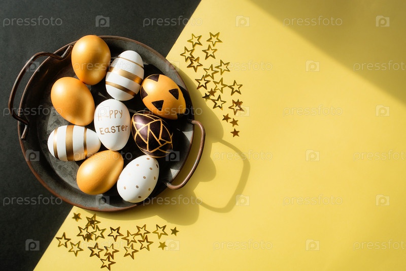 Золотые, черные, белые пасхальные яйца и конфетти в форме звездочек на желто-черном фоне. Геометрия. Минимальная концепция. Вид сверху. Карточка с местом для копирования текста
