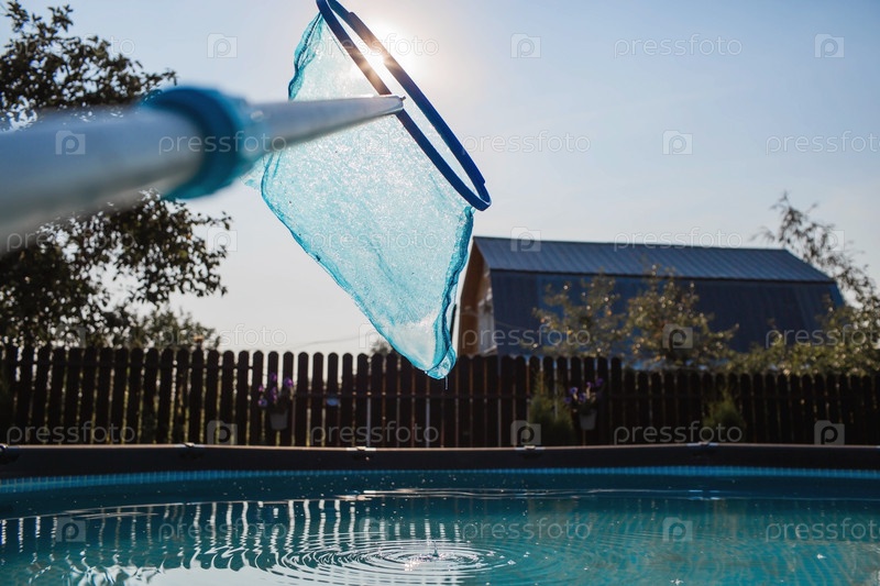 Абстрактное размытие и расфокусированный фон. Очистка бассейна с металлическим каркасом с сеткой от грязи. Очиститель бассейнов во время работы. Солнечное знамя. Концепция летнего отдыха