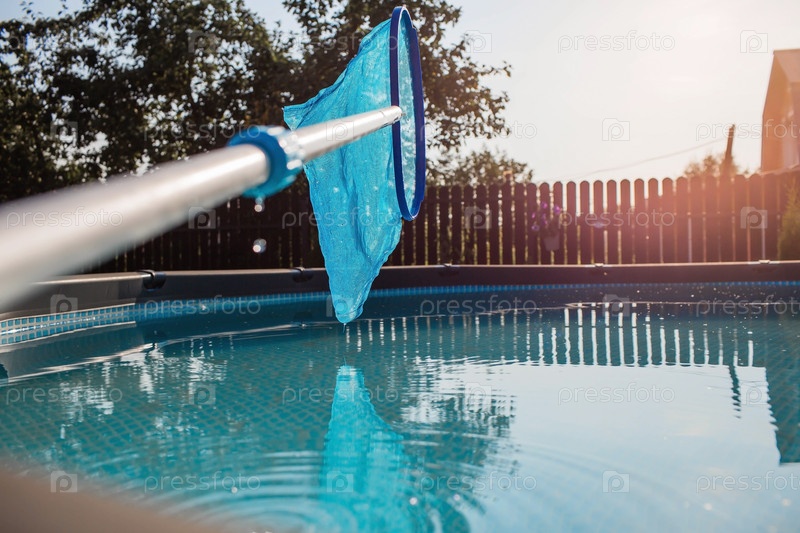 Абстрактное размытие и расфокусированный фон. Очистка бассейна с металлическим каркасом с сеткой от грязи. Очиститель бассейнов во время работы. Солнечное знамя. Концепция летнего отдыха