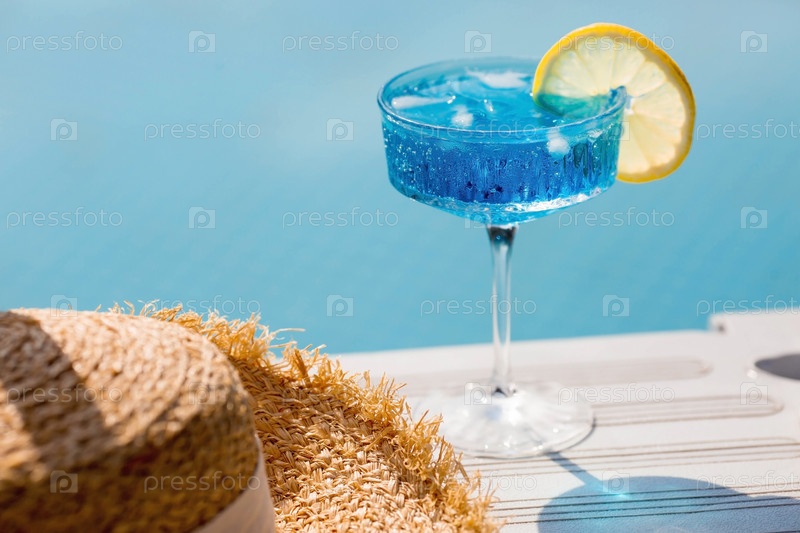 Стакан вкусного голубого коктейля Голубая лагуна и желтые лимоны на фоне бассейна. Алкогольный коктейль из сочных фруктов блю с ликером кюрасао, кубиками льда и долькой лимона
