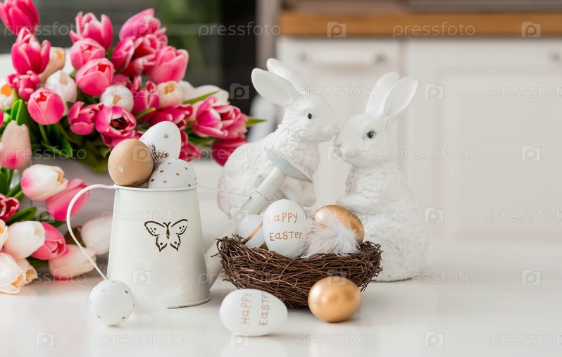 Букет тюльпанов, пасхальные кролики и яйца с золотым узором на столе. На заднем плане белая кухня в скандинавском стиле. Красивая открытка. Минимальная концепция