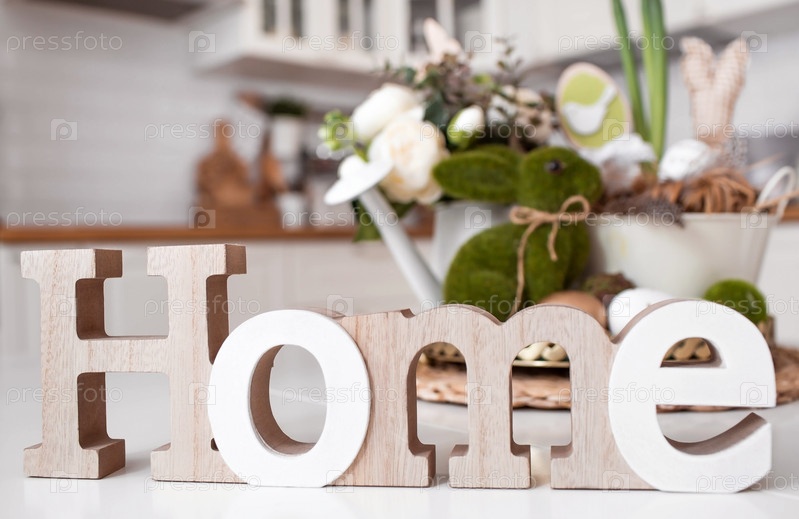 Железный горшок с пасхальными яйцами, цветами и кроликами на столе. На заднем плане белая кухня в скандинавском стиле. Концепция домашнего уюта и декора в светлый праздник Пасхи 2023