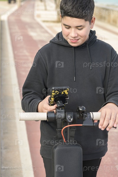Молодой человек едет на электрическом скутере на открытом воздухе, смотрит на приложение для смартфона, концепцию устойчивого транспорта, зеленую энергию с нулевым уровнем выбросов
