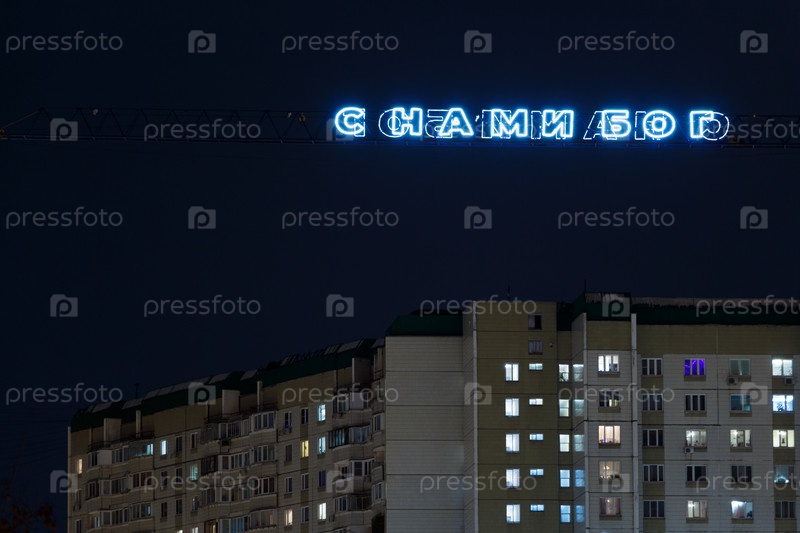 Надпись в ночном небе города «Бог с нами»