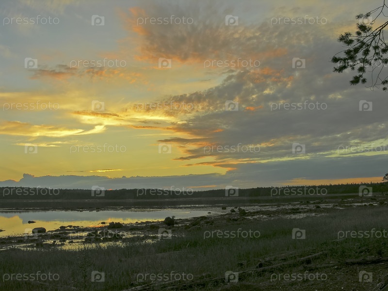 Закат солнца на берегу Белого моря. Остров Горелый, Керетская губа, Кандалакшкий залив, Карелия. Июль