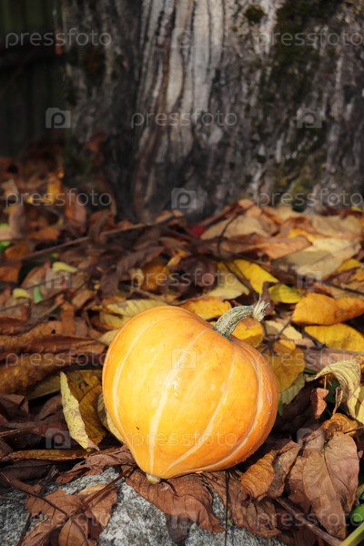 Тыква на камнях и сухие листья под деревьями