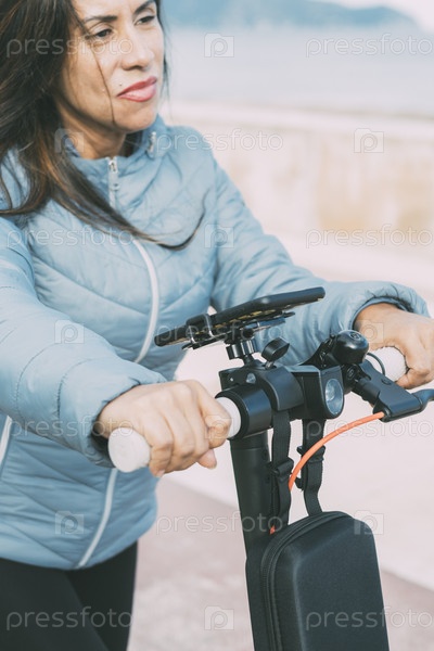 Красивая женщина средних лет в синей куртке ездит на электрическом скутере