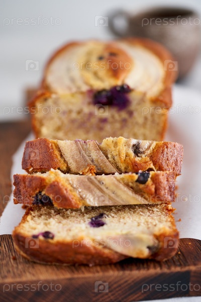 Банановый хлеб, кусок торта с бананом и черникой. Утренний завтрак с кофе