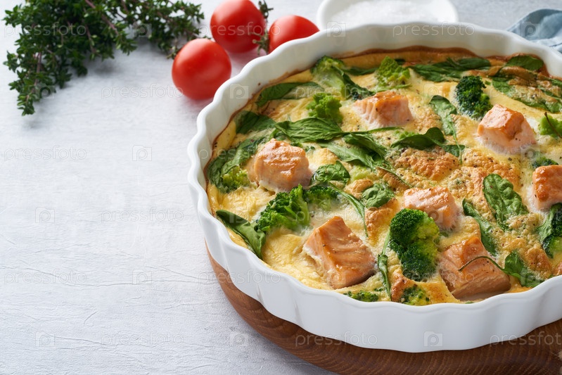 Фриттата на яичной основе, омлет с лососем, брокколи и шпинатом. Итальянское блюдо, пирог без корочки