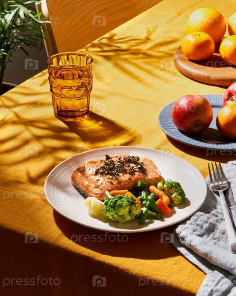 Яркая еда с лососевыми овощами. Летний или весенний солнечный день или вечер. Яркая концепция